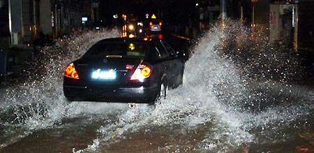 A car wades ahead in the flood water as typhoon Sepat lands with heavy winds and downpours in Cangnan county of the coastal city of Wenzhou, east China's Zhejiang Province on August 18, 2007. [Xinhua]