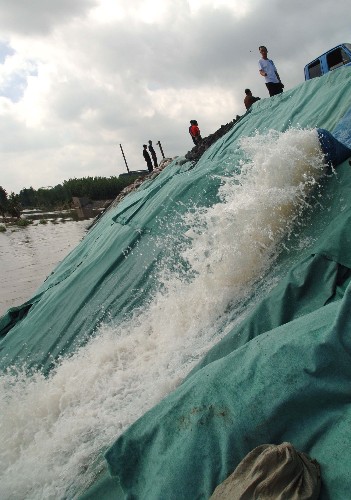 People watch as water is pumped out of a flooded shaft at Huayuan Coal Mine into the Wenhe River in East China's Shandong Province on August 21, 2007. By 7:00 am Tuesday, the water level at the mine where 172 miners have been trapped since Friday had fallen by 23.6 meters to 69 meters. [Xinhua] |