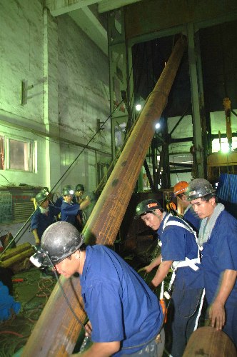 | Rescuers put a pipe in place to pump water from flooded shafts at Huayuan Coal Mine in East China's Shandong Province on August 21, 2007. By 7:00 am Tuesday, the water level at the mine where 172 miners have been trapped since Friday had fallen by 23.6 meters to 69 meters. [Xinhua] |