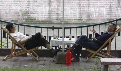 Updated: 2007-09-10 22:12 ![]() Men rest at an open-air tea house in Chengdu, Southwest China's Sichuan Province, September 10, 2007. Although coffee consumption is still less than one-tenth of tea consumption in China, it is becoming increasingly popular among Chinese, especially young people, because of its association with a Western lifestyle. Chinese drink 700,000 tons of tea per year. [Reuters]