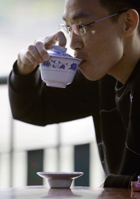 A man drinks a cup of tea at a tea house in Chengdu, September 10, 2007. [Reuters]