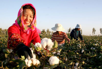 Farmers pick cotton at a cotton field in Hami, Northwest China's Xinjiang Uygur Autonomous Region September 14, 2007. [Newsphoto]