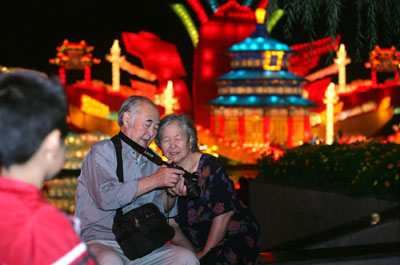 An old couple shares pictures during a lamp festival themed with the Beijing Olympic Games at a park in Beijing September 22, 2007. [Xinhua]