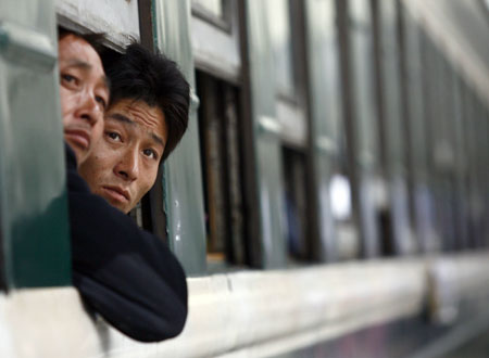 Passengers look out of the window from a train at a railway station in Shenyang, Northeast China's Liaoning province October 6, 2007. China's National Day which falls on October 1, was first officially extended to a week-long holiday in 1999. The National Day holidays have become a "golden week" for the economy with more people being encouraged to travel across the country. [Agencies]