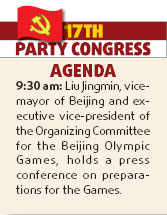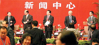 From left: Minister of Education Zhou Ji, Vice-Minister of Health Gao Qiang, Minister of Labor and Social Security Tian Chengping, Minister of Civil Affairs Li Xueju and Vice-Minister of Construction Qiu Baoxing attend a news conference on the sidelines of the 17th National Congress of the Communist Party of China in Beijing yesterday.Xu Jingxing |