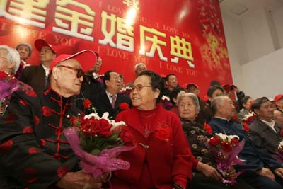 Senior couples attend the "golden marriage" celebration launched by a company in Luoyang, Central China's Henan Province to mark the Double Ninth Festival on October 18, 2007. The festival, which falls on the ninth day of the ninth month on lunar calendar, is viewed as an occasion to pay respect to the aged. [newsphoto]