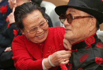 An elderly woman fixes a button for her husband during the "golden marriage" celebration launched by a company in Luoyang, Central China's Henan Province to mark the Double Ninth Festival on October 18, 2007. The festival, which falls on the ninth day of the ninth month on lunar calendar, is viewed as an occasion to pay respect to the aged. [newsphoto]