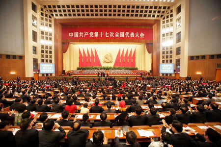 Delegates attend the closing session of the 17th National Congress of the Communist Party of China in the Great Hall of the People in Beijing October 21, 2007. The Closing Session was started at 9:00 am on Sunday, at which a new CPC Central Committee and the Central Commission for Discipline Inspection would be elected. [Xinhua]
