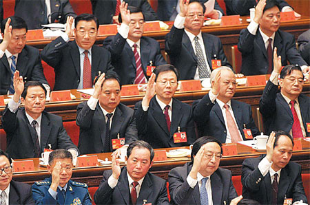 Delegates raise their hands to cast votes for a resolution on the Central Commission for Discipline Inspection's work report yesterday. Xu Jingxing |