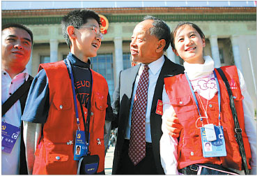 Li Zhaoxing (second from right), former foreign minister and a delegate to the congress, talks to student reporters from Chinese Teenagers News, outside the Great Hall of the People.Xu Jingxing