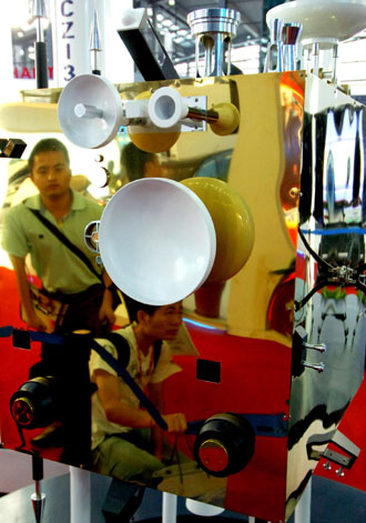 Visitors view a model of China's first man-made moon orbiter Chang'e I in Shenzhen October 13, 2007. The orbiter will be launched to the moon on October 24, 2007. [Xinhua]
