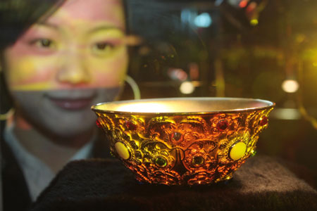 A woman looks at a golden bowl inlaid with gems at China International Exhibition Center in Beijing, November 1, 2007. The 2007 China International Jewellery Show kicked off in Beijing on Thursday, attracting 500 jewellery campanies from home and abroad. [Xinhua]