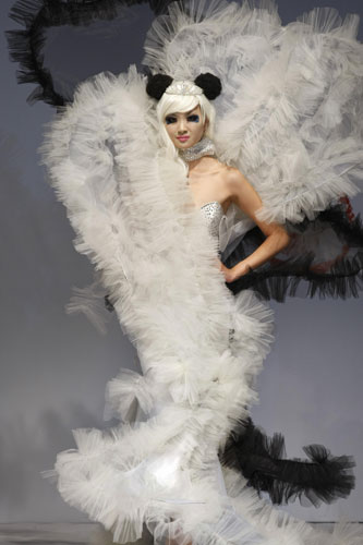 | A model, playing the part of a bride, presents a creation for Bandi-Panda fashion show by Chinese conceptual artist Zhao Bandi at China Fashion Week in Beijing November 4, 2007. Zhao uses the medium of fashion to present 33 Chinese social classes and social issues. [Agencies] |