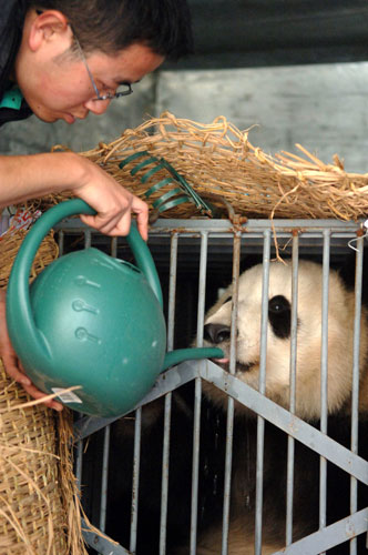 A keeper feeds US-born giant panda Mei Sheng at the Wolong Giant Panda Nature Reserve in Chengdu, Southwest China's Sichuan Province on Wednesday, November 7, 2007. Cubs born overseas to pandas on loan belong to China and must be sent back to the country after they become sexually mature. The 4-year-old Mei Sheng will now look for a mate. [newsphoto]