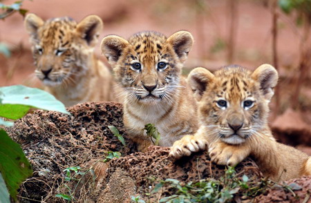 Three liger cubs rest in Hainan Tropical Wildlife and Botanical Garden in Haikou, Hainan Province November 20, 2007. The triplets born to "Young Blacky" and "Huan Huan" made their debut Tuesday in the wildlife park. The liger is a cross hybrid between a male lion and a female tiger. [Xinhua]