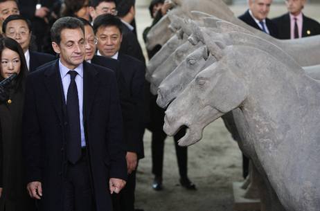 France's President Nicolas Sarkozy looks at preserved figures of horses of the buried Terracotta Army in Xi'an, on the first day of a three-day visit to China, November 25, 2007. [Agencies]