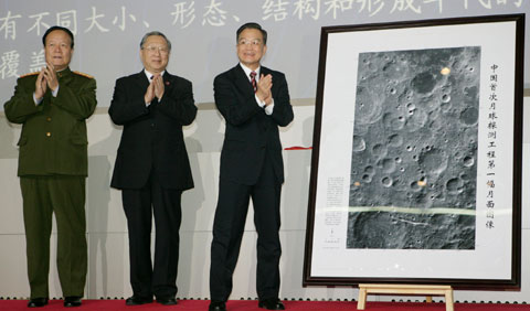 Premier Wen Jiabao (R) stands beside the first picture of the moon, sent back from the lunar probe Chang'e I, in Beijing November 26, 2007. [Xinhua]