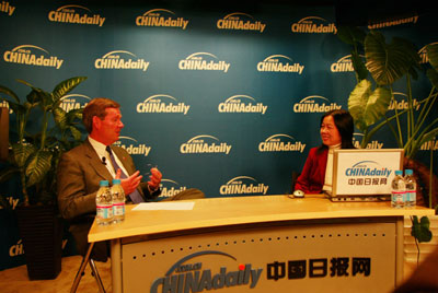 US Health and Human Services Secretary Mike Leavitt (L) is interviewed by Li Xing, chief of China Daily International Department, at the chinadaily.com.cn office in Beijing December 10, 2007. Leavitt is in Beijing for the China-US Strategic Economic Dialogue. [chinadaily.com.cn]