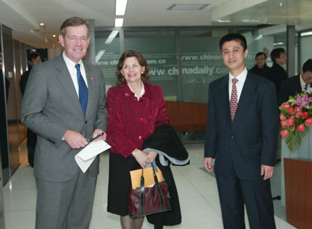 US Health and Human Services Secretary Mike Leavitt (L) and Gao Anming (R), president of chinadaily.com.cn, pose for a photo at the chinadaily.com.cn office in Beijing December 10, 2007. Leavitt answered questions from Chinese netizens during an interview. Leavitt is in Beijing for the China-US Strategic Economic Dialogue. [chinadaily.com.cn]