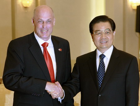 US Treasury Secretary Henry Paulson (L) shakes hands with China's President Hu Jintao during a meeting at the Great Hall of the People in Beijing December 13, 2007. Under agreements reached at the concluding day of the Third China-US Strategic Economic Dialogue (SED), qualified foreign-invested companies, including banks, will be allowed to issue renminbi-denominated stocks and bonds. [Agencies]