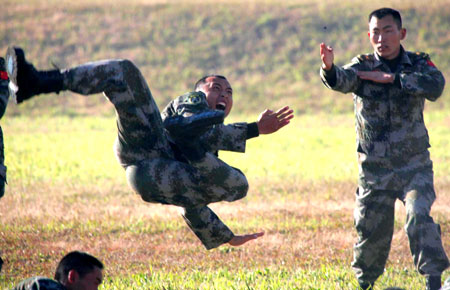 Chinese soldiers perform the traditional Chinese martial arts during a joint military exercise between China and India in Kunming, Southwest China's Yunnan Province, December 21, 2007. [Xinhua]