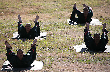 Indian soldiers practice yoga during a joint exercise held between China and India in Kunming, the capital city of Southeast China's Yunnan Province, on Friday. [Xinhua]