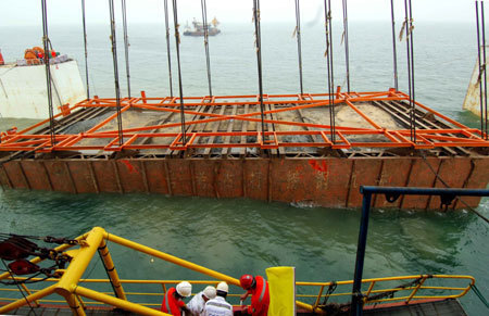 A specially designed basket that holds the Nanhai No.1, the Song Dynasty sunken ship, is partially lifted out of the water Friday, December 21, 2007. [Xinhua]