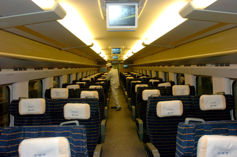 A worker adjusts the seat of a CRH2-300 bullet train, with a speed of over 300 kilometers per hour in Jinan, Shandong Province December 22, 2007. [Xinhua]