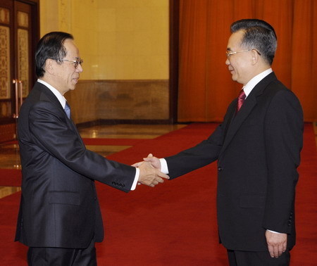 Japanese Prime Minister Yasuo Fukuda (L) shakes hands with Chinese Premier Wen Jiabao during a welcome ceremony at the Great Hall of the People in Beijing December 28, 2007. Fukuda is on a four-day visit to China to further improve and develop bilateral relations. [Agencies]