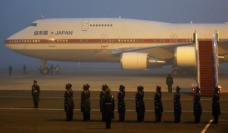 Chinese soldiers stand in formation in front of Japanese Prime Minister Yasuo Fukuda's plane after it arrived in Beijing December 27, 2007. Fukuda is scheduled to meet President Hu Jintao, top legislator Wu Bangguo and Premier Wen Jiabao on Friday. [Agencies]