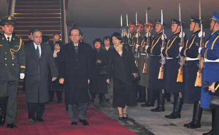 Japanese Prime Minister Yasuo Fukuda (C) walks past a Chinese honour guard as he arrives in Beijing December 27, 2007. Fukuda is scheduled to meet President Hu Jintao, top legislator Wu Bangguo and Premier Wen Jiabao on Friday. [Agencies]
