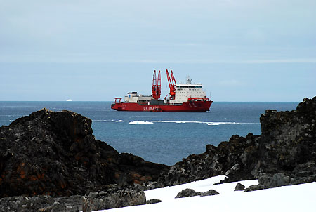 China's expedition ship "Xuelong", or Snow Dragon, docks at King George Island before arriving at the Changcheng Station, or Great Wall Station, in western Antarctic, January 5, 2008. The exploration team succeeded in reaching the destination with supplies for the Great Wall Station, which was built in 1985, January 5, 2008. [Xinhua]