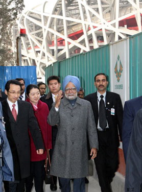 Singh made the remarks while visiting an exhibition center near the National Stadium, the Bird's Nest, in the north of the Chinese capital. The center showcases scale models of the Bird's Nest, "Water Cube", or the National Aquatic Center, and other Olympic venues. Singh, wearing a blue turban and clad in a grey overcoat, was accompanied by vice mayor of Beijing Chen Gang, who has escorted many foreign heads of state, including French President Nicolas Sarkozy, to the Olympic stadiums. The prime minister nodded in agreement when Chen said the use of the venues after the Olympics should be considered, especially in heavily populated countries such as China and India. Singh said the infrastructure and other work Beijing has done for the Olympics merit attention from the Indian people in preparing for big events like the Commonwealth Games. After the visit, Singh wrote in the guestbook: "On behalf of the government and people of India, I extend my best wishes for the success of the Olympic Games in Beijing. I hope that the Olympic spirit and warmth of the great city of Beijing will promote friendship, peace and understanding among all participants and countries they represent." Singh arrived in Beijing on Sunday morning for his three-day trip to China, the first since he took office in 2004. President Hu Jintao and top legislator Wu Bangguo will meet with Singh. Premier Wen Jiabao will hold talks with Singh. |