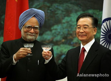 Chinese Premier Wen Jiabao (R) toasts with visiting Indian Prime Minister Manmohan Singh after a signing ceremony at the Great Hall of the People in Beijing January 14, 2008. Wen said that Sino-Indian relations face important strategic chances as he met with the Indian Prime Minister. [Asianewsphoto]