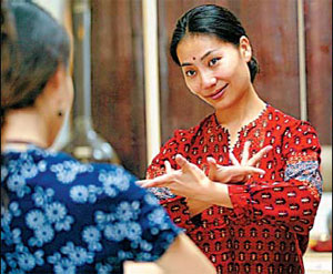 Updated: 2008-01-15 07:21 Dressed in an Indian gown and with a red spot on her forehead, Jin Shanshan sat cross-legged on a small Indian carpet. In front of her on the ground lay a Talam, a wooden instrument used as the metronome in India. She chanted "ta ta ta" as she struck out beats on the Talam. She watched a girl quickly stamping her feet and dancing different poses. Once in a while, Jin stood up and demonstrated to her student the right hand gestures and facial expressions.