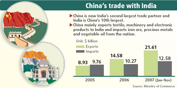 China's exports to India stood at $21.61 billion in the first 11 months last year, while imports hit $12.58 billion, the Ministry of Commerce said. The imbalance has raised concerns in India.