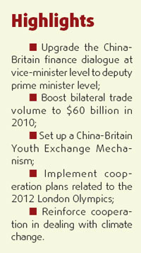 Visiting British Prime Minister Gordon Brown and Chinese leaders agreed on Friday to push forward a "comprehensive strategic partnership" that contains not only multi-billion-dollar trade deals but also closer cooperation on global challenges. In a gesture showing Britain's embrace of Chinese capital, Brown offered London as the overseas base for China's $200 billion sovereign wealth fund despite some other countries' misgivings about the Chinese fund. "This is a very substantial fund. It can be invested positively. I realize that in some countries it is controversial, but I have talked to Premier Wen Jiabao," Brown told reporters after a meeting with Wen. "We want Britain to be the No 1 destination for China's business as it looks to invest around the world. Tens of thousands of jobs in Britain can be created through cooperation between our two countries," he said. China Investment Corporation (CIC), the sovereign wealth fund, was founded last year to manage part of the country's $1.5 trillion in foreign exchange reserves.