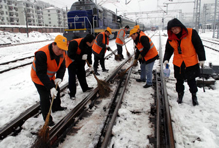 About 8,800 of the 9,500 long-distance coaches scheduled to depart central Chinese city of Wuhan have been cancelled, affecting 300,000 passengers. Blizzards cut off all the expressways in central China's Shanxi and Henan provinces and most expressways in eastern Jiangsu province. "People usually turn to railway transportation, which is less affected by bad weather, when there are expressway closures and flight cancellations and delays," said Ministry of Railway spokesman Wang Yongping. On Saturday alone, railways across the country delivered 4.5 million passengers, up 44.5 percent from a year ago, according to the latest data from the ministry. "The number of railway passengers this year could be much larger than ever," Wang said. The ministry previously forecast that China's railways would carry a record 178.6 million passengers during the travel rush from January 23 to March 2, up from 156 million last year. Accidents have happened. Leng Jing, a student from the Anhui Normal University, was killed after being falling off an overcrowded platform in a railway station in Wuhu, Anhui province. In Changsha, Hunan, more than 100 passengers holding tickets failed to board a packed train. The heads of both stations were sacked by Monday. Meanwhile, a Beijing airport official said "a few" flights on Monday had been delayed because of snow, but gave no further details. The National Meteorological Center forecast that heavy snows and rains would continue to hit the central provinces of Henan and Hubei and eastern provinces of Shandong, Jiangsu and Anhui in the next two days. The Ministry of Communications has issued an urgent notice, ordering local transport departments to be well prepared for further possible emergencies caused by the extreme weather. |