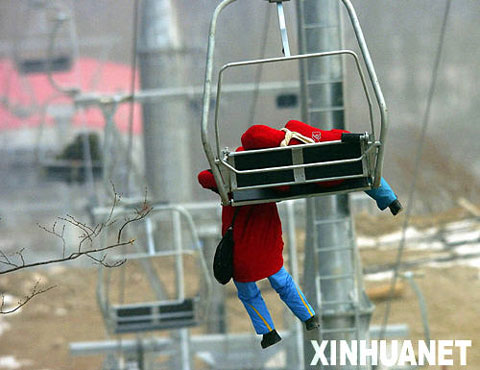 Hou Shuangmei, a broadcaster at the 11th China Winter Games in Yabuli, Heilongjiang Province, dangles in mid-air from a moving ski lift on Wednesday, January 23, 2008. A colleague tried to hold on to her but seconds later she lost her grip and fell several meters to the ground. Late Wednesday night she was in a serious condition.[xinhuanet]