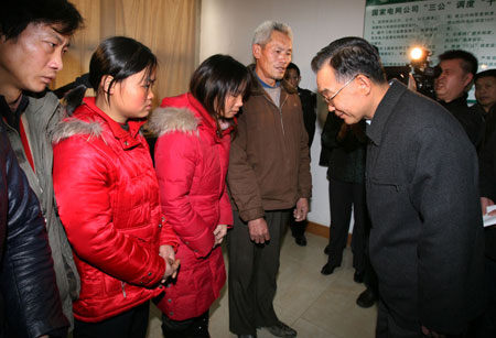 Updated: 2008-01-29 17:16 ![]() Premier Wen Jiabao bows to the family members of the three victims who were killed when de-icing the power cable tower in Changsha, Hunan province on Tuesday Jan 29, 2008. [Xinhua]