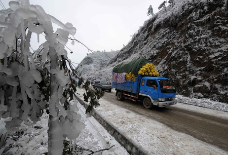 Updated: 2008-02-01 00:29 ![]() ![]() A truck carrying fruit moves on the road in Southwest China' Guangxi Zhuang Autonomous Region, heading for snow-hit Hunan Province, January 31, 2008. [Xinhua]