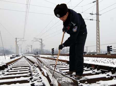 A police officer cleans ice and snow on railway track in Southwest Chian's Chongqing Municipality January 31, 2008. [Xinhua]