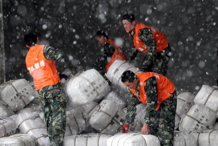 Updated: 2008-02-01 23:29 ![]() Soldiers load quilts and winter clothes onto trucks in snow in Wuhan, Central China's Hubei Province to transport the materials to blizzard-hit provinces. More bad weather was forecast for China's central, southern and eastern regions which were already paralysed by record-breaking cold and snow. [Xinhua]