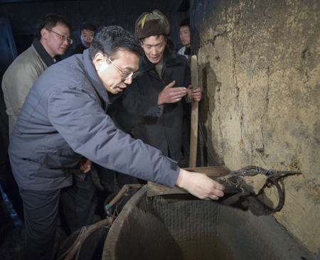 Li Keqiang (front), a member of the Standing Committee of the Political Bureau of the Central Committee of the Communist Party of China (CPC), checks the water faucet in a local villager’s house in Linshui County,Southwest China’s Sichuan Province, February 1, 2008. [Xinhua]