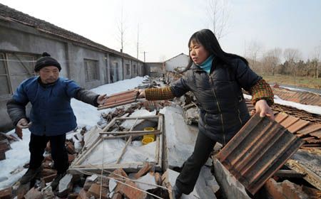 Poultry breeder Wen Liangjiu (R) cleans the debris at her henhouse, which was damaged during the severe snow disaster in January, in Santang Village, Shucheng County, East China's Anhui Province, Feb. 17, 2008. Shucheng is recovering with a full-scale reconstruction after suffering severe damage during this year's snow disaster. [Xinhua]