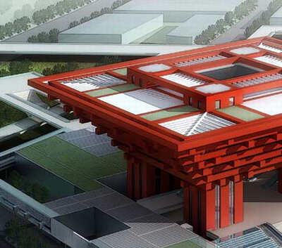 Sudoku-style roof is lifted first time for China's pavilion at the 2010 World Expo February 18, 2008. The main structure of the China Pavilion,"The Crown of the East," has a distinctive roof, made of traditional dougong or brackets, which has a history dating back more than 2,000 years. [Xinhua]