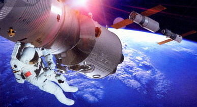 This virtual image from China Academy of Space Technology shows an astronaut spacewalking outside the Shenzhou VII spaceship. [China Daily]