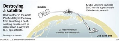 Updated: 2008-02-21 19:11 BEIJING - China on Thursday called on the United States to provide relevant data on its shooting down of a damaged US spy satellite. China is continuing to closely follow the possible harm caused by the US action to outer space security and relevant countries, said the foreign ministry spokesman Liu Jianchao in response to a question on the US shootdown of an out-of-control spy satellite. "China requests that the US fulfil its international obligations and promptly provide to the international community the necessary information so that relevant countries can take precautions." Liu said. A missile launched from a US Navy cruiser shot down a dying and potentially deadly US spy satellite deployed in the North Pacific late Wednesday. |