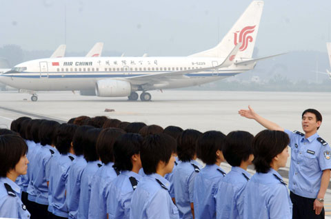 Police officers undergo training at the Beijing Capital International Airport in this September 18, 2007 photo. The police will do their best to guarantee security at the airport during the Olympic Games in August. [Xinhua]
