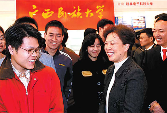Chen Jiwa, (front right), director of the organization department of the Guangxi committee of the Communist Party of China, chats with a job-hunter at a career fair organized by the Guangxi government in Beijing on Saturday. [China Daily]